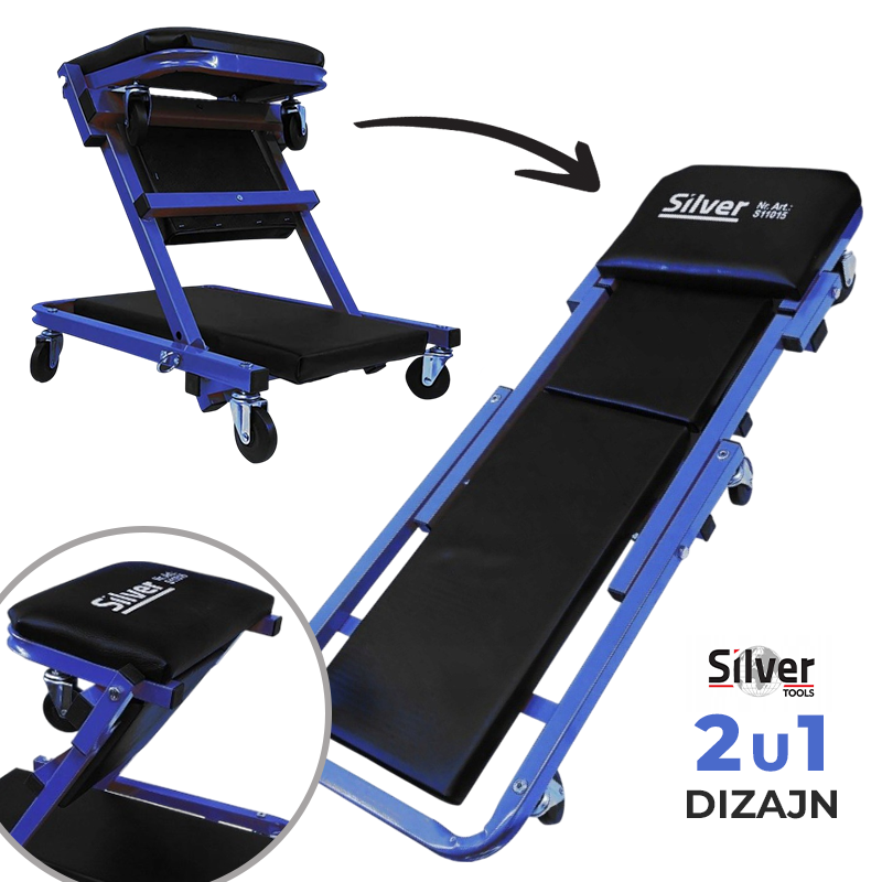 Sklopivi radionički ležaj dizajniran je za profesionalne auto radionice, servise i privatne korisnike. Njegov višenamjenski 2-u-1 dizajn omogućuje praktično korištenje kao ležaljke za rad ispod automobila ili kao udobnog sjedišta za rad pored vozila.