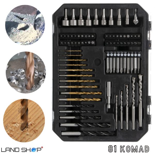 U setu se nalazi 81 komada raznih svrdala za metal, drvo i beton, nastavaka za odvijač.