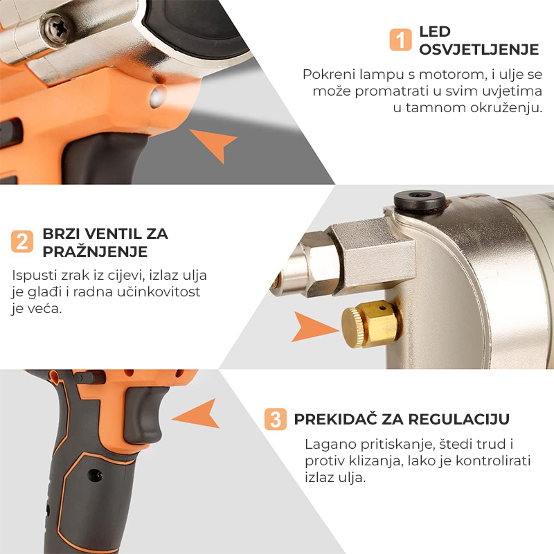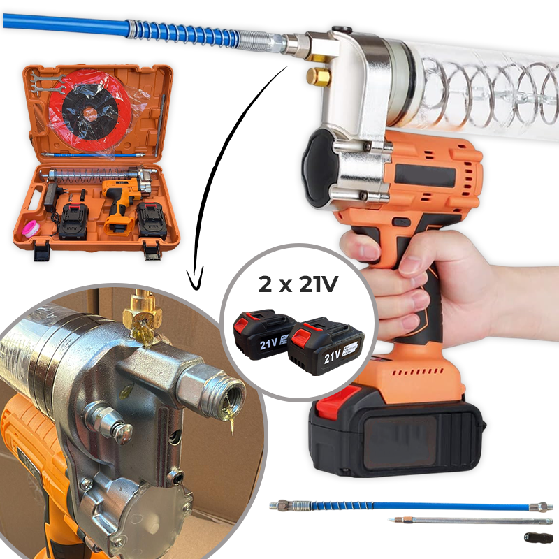 Aku Stroj za podmazivanje ležaja idealan je alat za brzo, učinkovito i jednostavno podmazivanje ležajeva, zglobova i drugih mehaničkih dijelova. Ovaj profesionalni uređaj osigurava precizno nanošenje maziva, smanjujući trenje i produžujući vijek trajanja strojeva i vozila. Zahvaljujući snažnim baterijama, omogućuje neprekidan rad bez potrebe za ručnim pumpanjem.