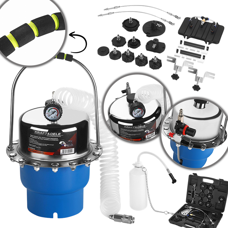 Profesionalni pneumatski set za brzo odzračivanje kočionog sustava te zamjenu kočione ili tekućine kvačila. Namijenjen je za osobna vozila, dostavna vozila i motocikle — idealan za radionice i kućne garaže.