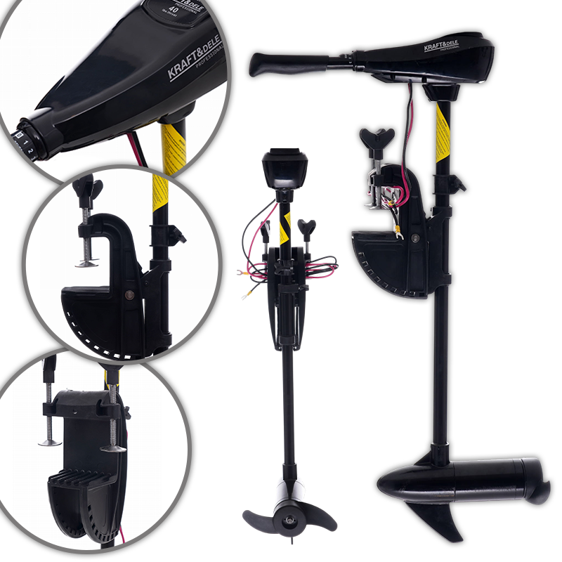 Električni izvanbrodski motor marke KRAFT&DELE sa snagom potiska od 64 lbs, namijenjen čamcima i gumenjacima. Kompaktna konstrukcija omogućuje jednostavnu montažu i korištenje na manjim plovilima.