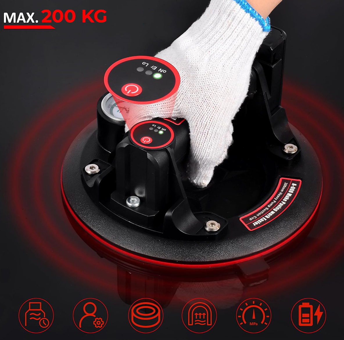 Aku vakuum za pločice i staklo osmišljen je za sigurno i učinkovito rukovanje pločicama, staklom, granitom, metalnim pločama i drugim glatkim površinama. Snažna usisna moć do 200 kg osigurava stabilno i čvrsto prijanjanje, dok bežični rad pruža potpunu slobodu kretanja i praktičnost korištenja.