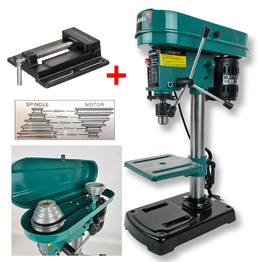 MEAKIDA Stupna bušilica je odličan alat za zahtjevnije majstore koja snagom od 1550W , od minimalnih 580 - 2650 okretaja u minuti garantira precizno bušenje rupa. Bušilica je opremljena graničnikom dubine, a postolje je robusno i stabilno što dodatno povećava razinu preciznosti. Visina postolja i nagib se može regulirati u bilo kojem trenutku bez upotrebe dodatnog alata. Moguće je koristiti svrdla promjera do 13 mm te se mogu bušiti različiti materijali kao što su drvo, metal, plastika, Uz bušilicu se isporučuje i škripac za prihvat materijala kojeg bušite.