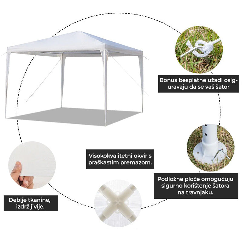 Ovaj vrtni paviljon pruža zaštitu od prekomjernog sunca i kiše, što ga čini idealnim za roštilje, događaje na otvorenom, piknike u vrtu i kao komercijalni šator. Noge paviljona opremljene su nosačima za pričvršćivanje na tlo.