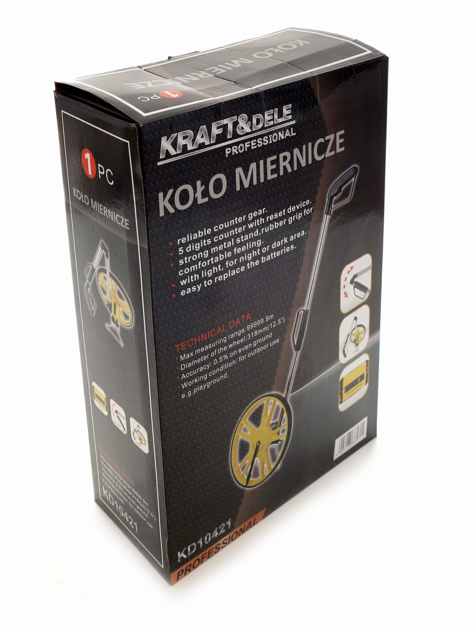 Profesionalno mjerno kolo s velikim dometom do 99.999,9 m i preciznošću od 0,5%. Idealno za građevinu, ceste, vrtove i terenske radove.