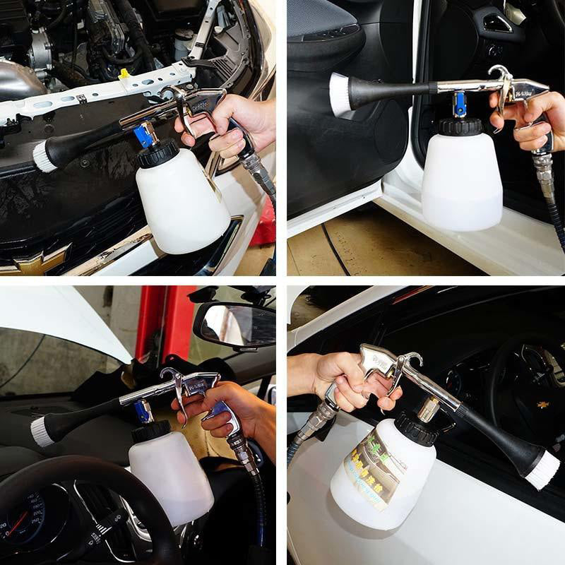 Ppneumatski pištolj za pranje s kapacitetom od 1 L, nezamjenjiv alat za dubinsko čišćenje tapeciranog namještaja i unutrašnjosti automobila. Dizajniran za mokro čišćenje, ovaj pištolj bez problema uklanja sve vrste prljavštine, od karoserije do unutrašnjosti vozila, uključujući ventilacijske otvore, klima uređaje, retrovizore, plastične elemente, sjedala, presvlake, tepihe te čak i najtvrdokornije mrlje i krhotine.