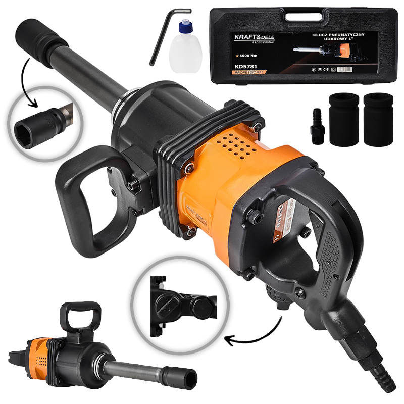 Profesionalni udarni ključ izuzetne snage od 5500 Nm. Namijenjen za otpuštanje i zatezanje velikih vijaka na kamionima, građevinskim strojevima i industrijskim postrojenjima. Isporučuje se u čvrstom koferu s dvije nasadke.