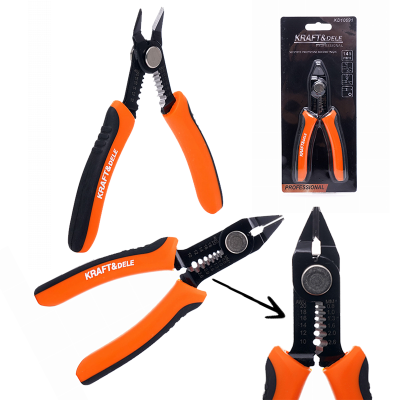 Kliješta KD10691 kombiniraju dvije ključne funkcije u jednom alatu – precizno rezanje i pouzdano stezanje žica. S ukupnom duljinom od 145 mm i usklađenim AWG standardom, omogućuju dosljednu i točnu obradu bez pogrešaka. Tanki vrh olakšava rad u uskim i teško dostupnim prostorima, dok sigurnosno otpuštanje zaustavlja stezanje u pravom trenutku.