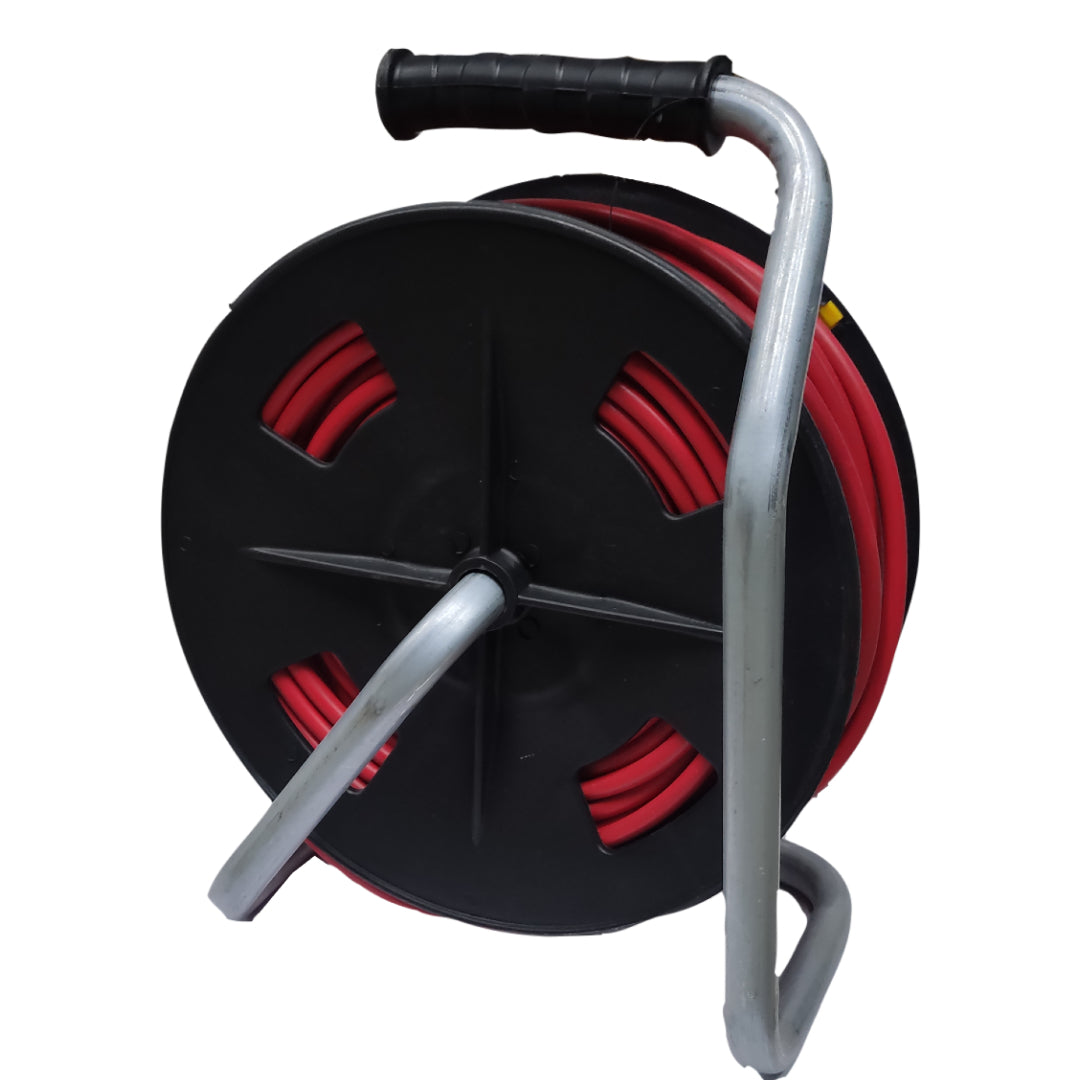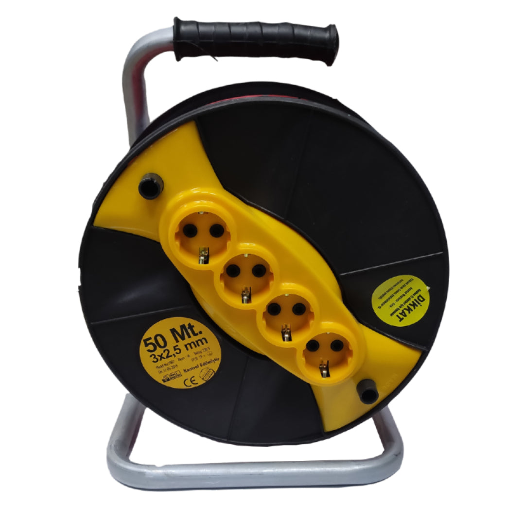 Produžni kabel na kolutu za napajanje više uređaja na jednom mjestu. Kabel je dug 50 metara. Dolazi s 4 utičnice i toplinskim osiguračem.