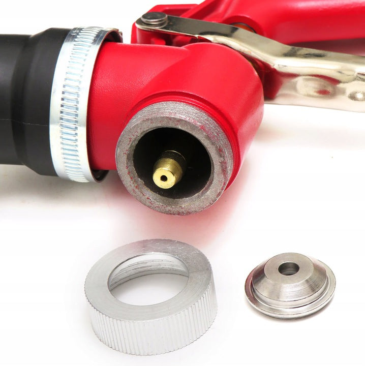 šprica sa velikim diznama i velikim spremnikom 7,5L za strojnu žbuku gipsanje i ostale guste materijale - emulzije . U kompletu dolaze i tri dizne različitih promjera 4, 6 i 8 mm. Mortalica, žbukerica .