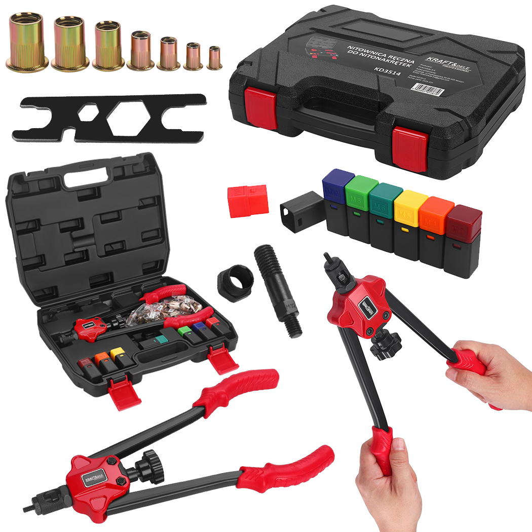 Profesionalni set kliješta za ugradnju navojnih zakovica omogućuje brzo, čvrsto i precizno spajanje metalnih dijelova. Idealan je za radionice, servise, montaže, autoindustriju i kućne majstore.
