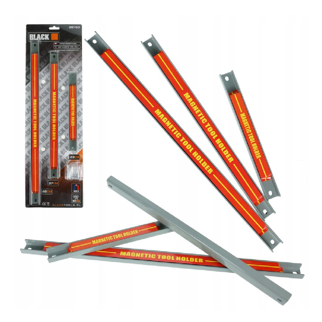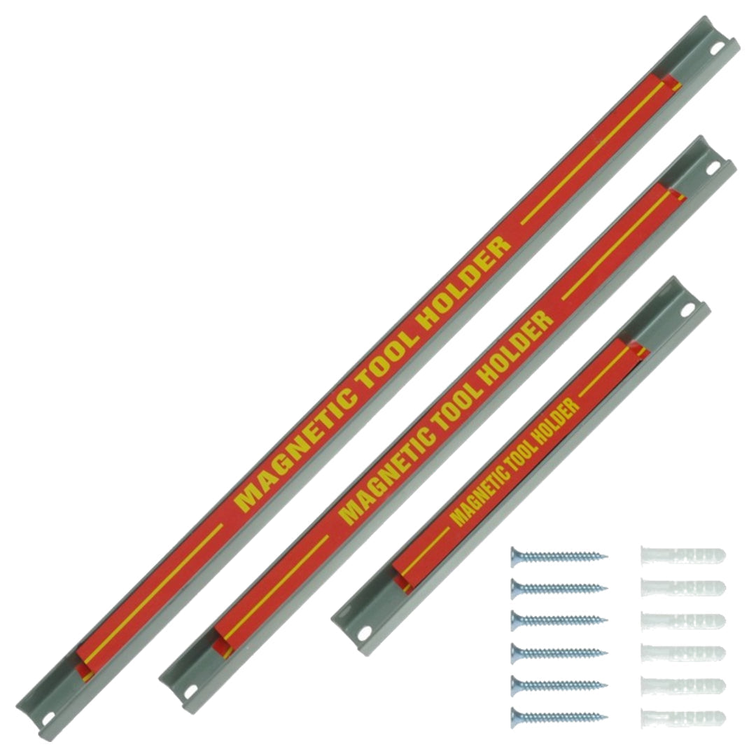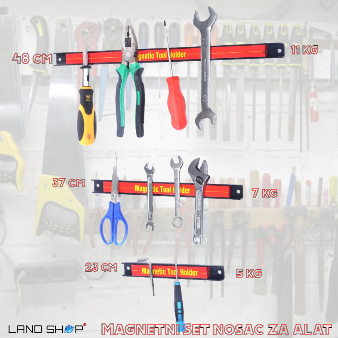 Nosač za alat sadrži komplet tri robusne magnetske trake koje se pričvrste na zid priloženim vijcima te pružaju praktično mjesto za odlaganje alata poput odvijača, ključeva i slično.