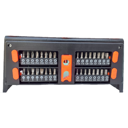 Set odvijača i bitova 51 -dijelni. Komplet odvijača i bitova marke Kraft & Dele . Priloženo postolje olakšava spremanje odvijača.