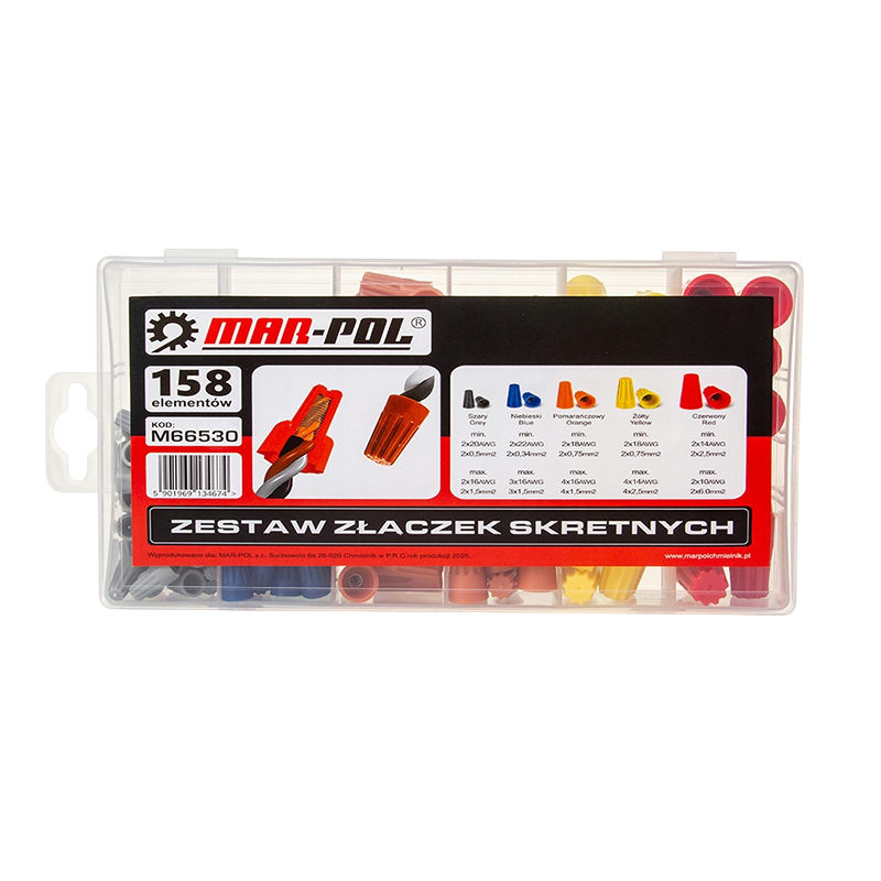 Praktičan set vrtljivih (spiralnih) kabelskih konektora namijenjen je za brzo i sigurno spajanje kabela različitih presjeka. Zahvaljujući jednostavnom principu uvrtnog spajanja, konektori omogućuju stabilan i pouzdan kontakt bez potrebe za lemljenjem ili dodatnim alatima.