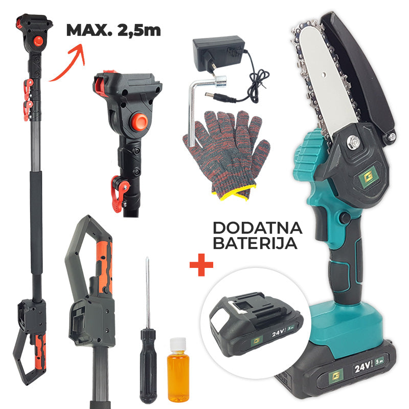 Podesivi teleskopski štap: Opremljen je podesivim štapom koji se može rastegnuti do maksimalno 2,5 metara, omogućujući dosezanje visokih grana ili mjesta koja su inače nedostupna bez upotrebe ljestava ili penjanja.
