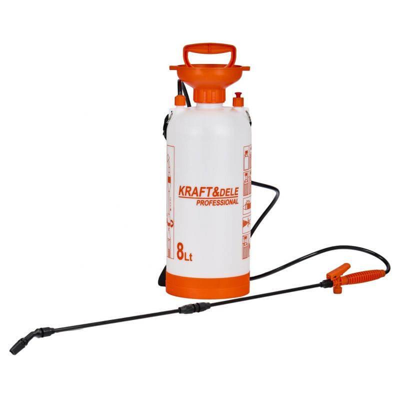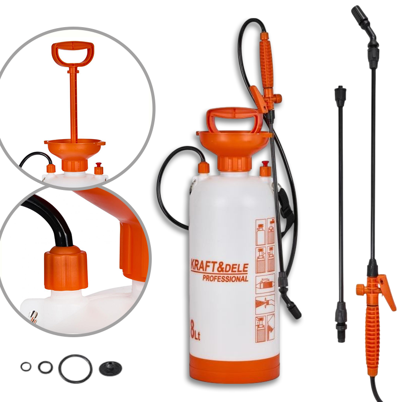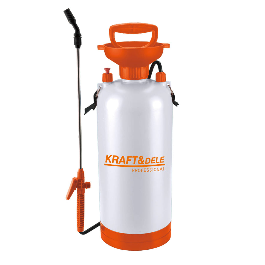 Tlačna prskalica, ručna, 8L | KRAFT-DELE jamči jednostavno i učinkovito korištenje, idealan je za primjenu insekticida, gnojiva i sredstava za čišćenje. Zahvaljujući robusnoj konstrukciji, udobnoj ručki i dugačkom produžetku za prskanje, omogućuje učinkovito i precizno raspršivanje tekućina na biljke, travnjake ili druge površine.