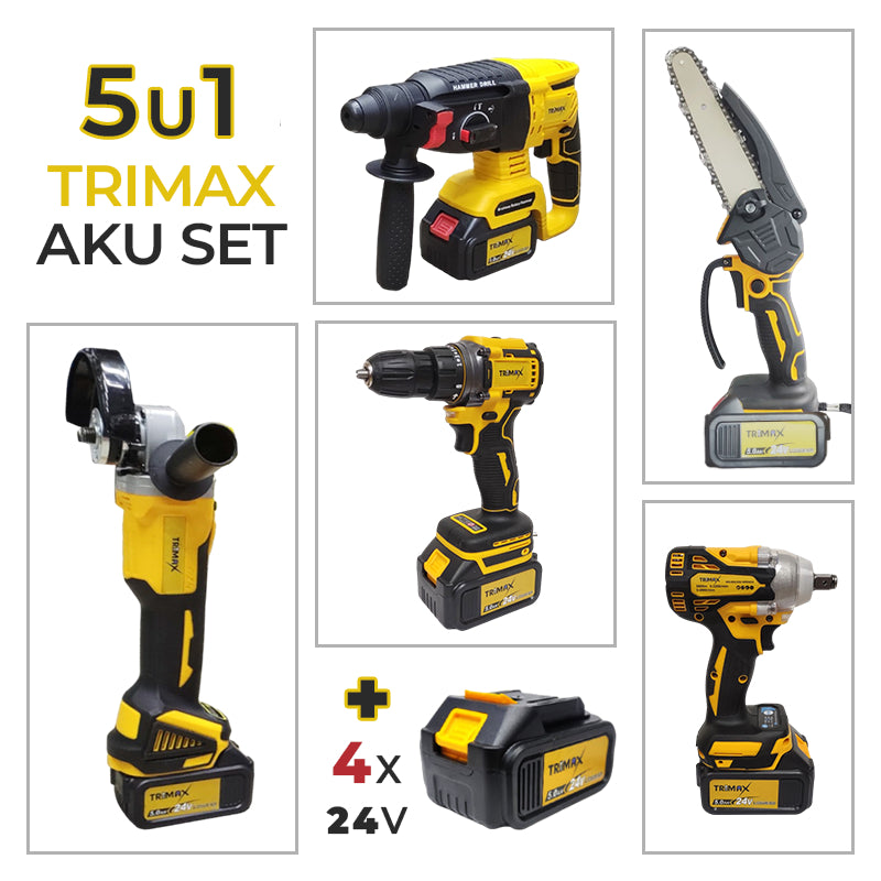 Uz set dolaze ukupno 4 baterije 5AH Li-ion , omogućavajući neprekidan rad bez čestih punjenja. Sve baterije kompatibilne su sa svim Trimax, Garten Kaiser i Makita alatima.