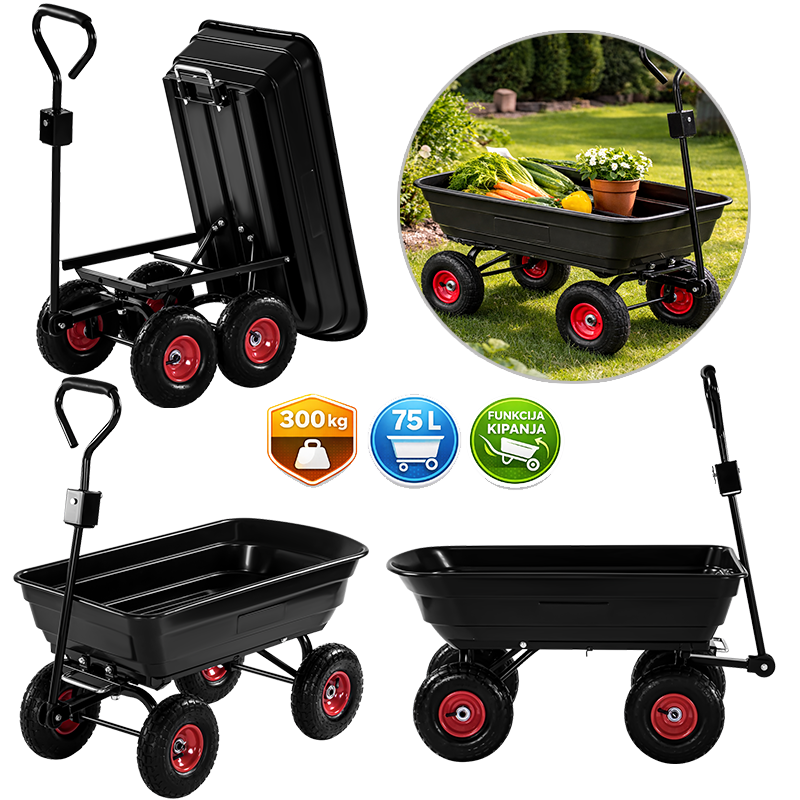 Robusna konstrukcija izrađena od ojačanog čelika i izdržljive plastike osigurava stabilnost i dug vijek trajanja, čak i pri intenzivnoj uporabi. Pneumatski kotači omogućuju lako kretanje po neravnom terenu, dok ergonomska ručka pruža udobno i sigurno upravljanje. Funkcija kipanja omogućuje brzo i jednostavno istovarivanje tereta.