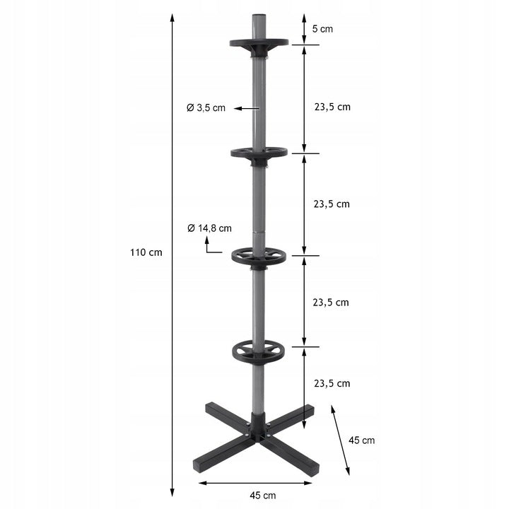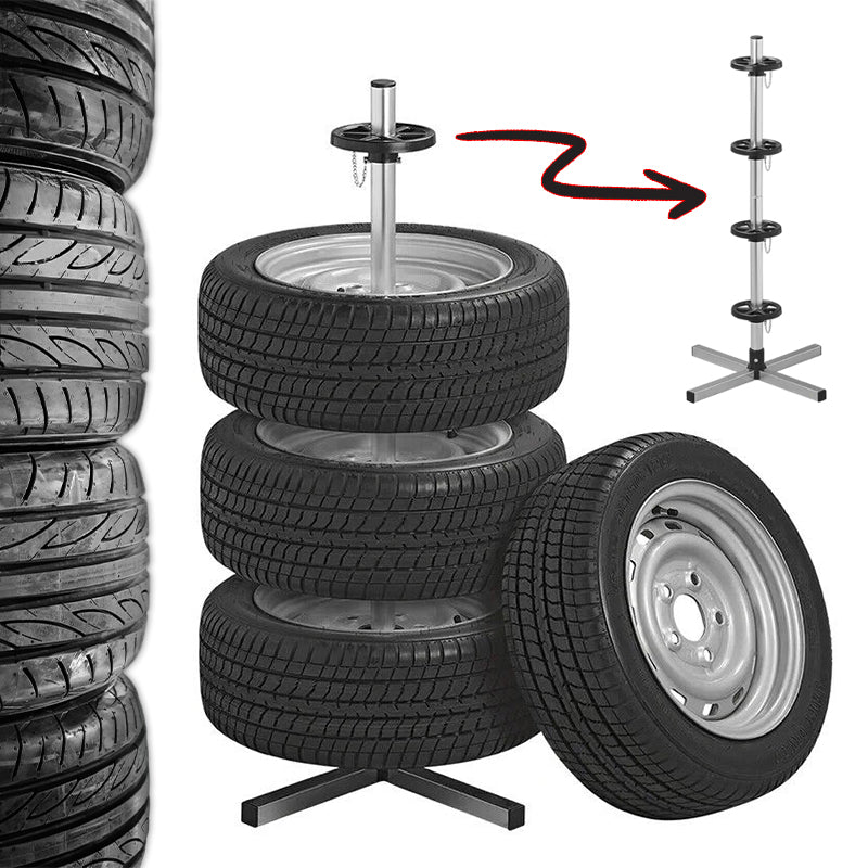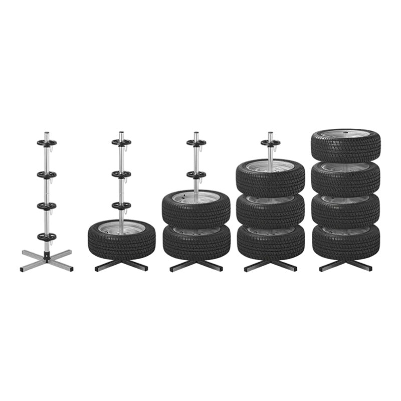 Stalak za gume prikladan je za pravilnu pohranu četiri auto gume. Izrađen je od robusnog metala koji osigurava dugi vijek trajanja i stabilnost. Stalak za gume odgovara gumama širine do 235 mm.